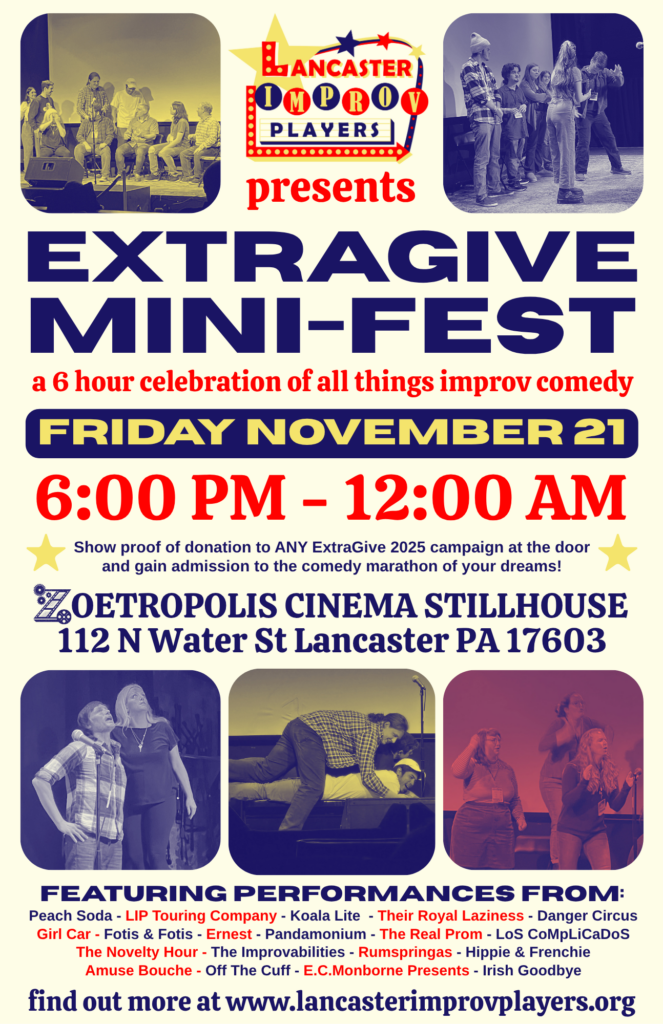 Lancaster Improv Players presents the EXTRAGIVE MINIFEST for its third year in a row! Join in a 6 hour celebration of all things improv comedy, featuring teams from around the city and state.