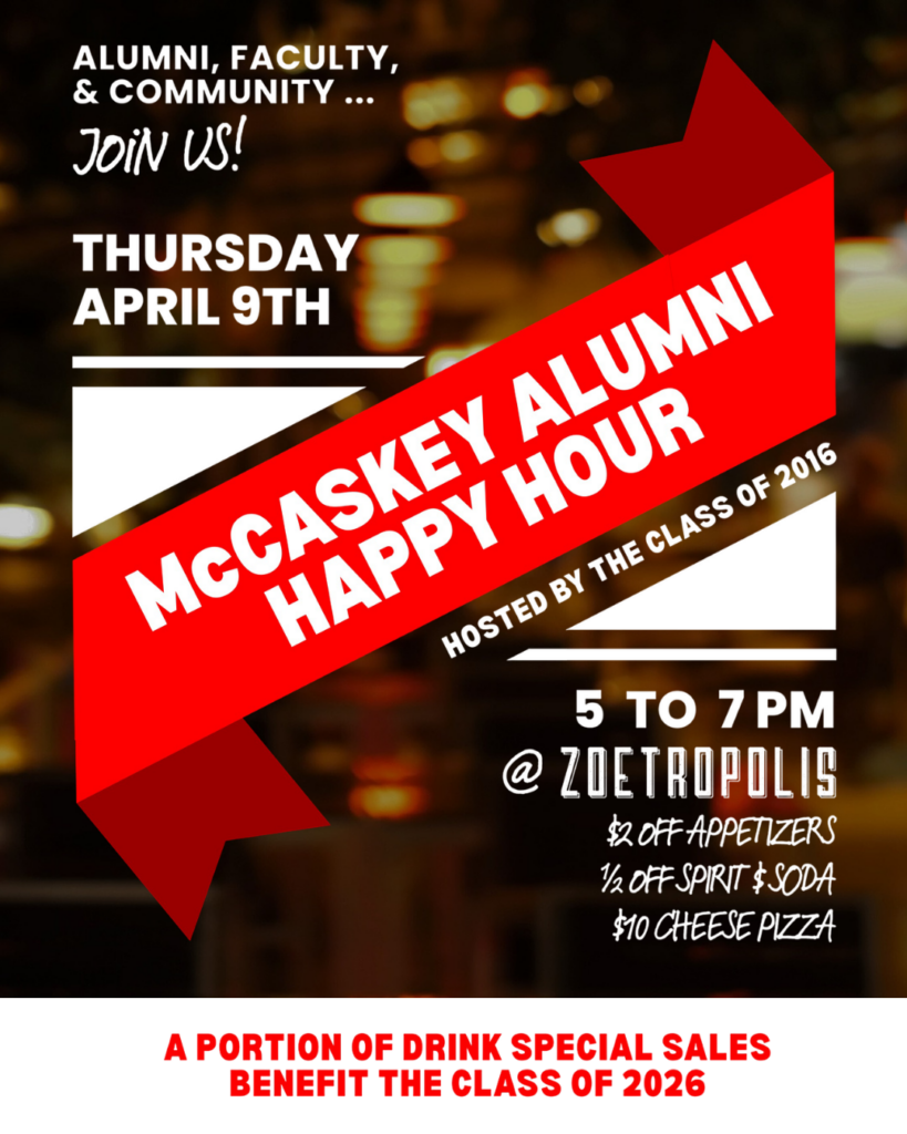 McCaskey’s Class of 2016 is hosting an Alumni Happy Hour, inviting alumni from all classes to gather together with current and former faculty and other supporters for an evening of reconnecting the McCaskey community!
