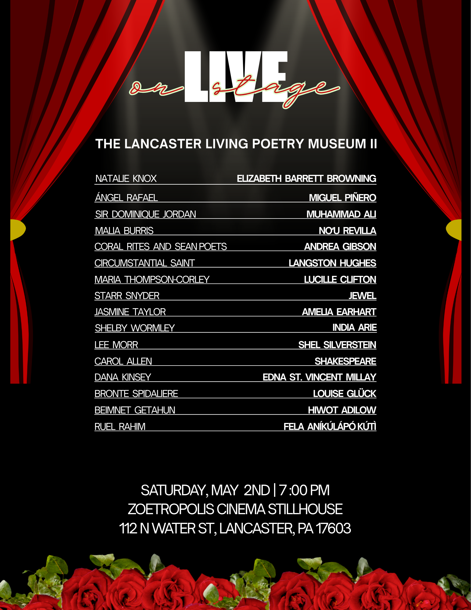 Join Dana Kinsey, Lancaster City Poet Laureate, for a night of live theatre as The Lancaster Living Poetry...